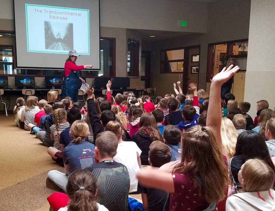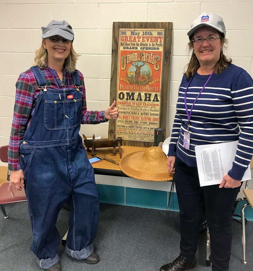 The Kaysville – Fruit Heights Museum is commemorating Spike 150 by discussing the memorabilia and photos related to this important event in the nation’s history. The students’ favorite part is a Jeopardy Contest between classes conducted by Christine Deppe and Fay Croxford. These museum board members trade off each presentation with one dressing as the train engineer and presenting while the other runs the slide show. One slide talks about a newly discovered piece of history, how the Kaysville Brass Band played as the train headed to Promontory came out of Weber Canyon. Those band members were the first Utahns to ride into the greater Salt Lake – Ogden Valley by train. Students also sing along to “I’ve Been Workin’ on the Railroad.” Deppe and Croxford plan to visit every elementary 4th grade in all the Kaysville/Fruit Height Schools over the course of several weeks. They are delighted with the opportunity to tell how a museum can bring more exciting stories to students.